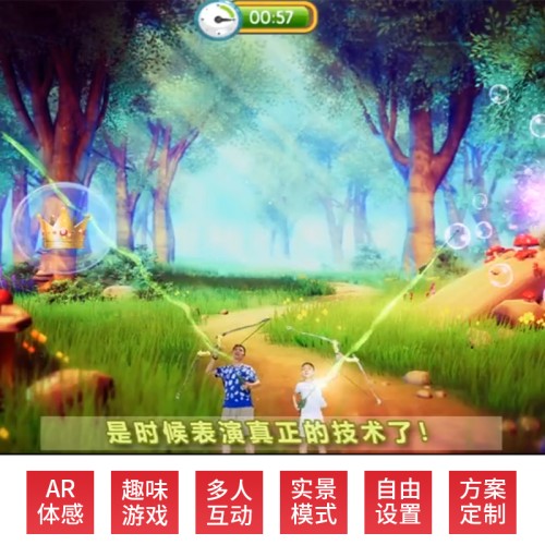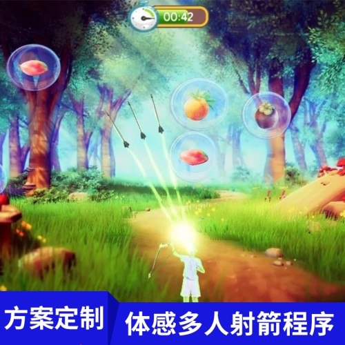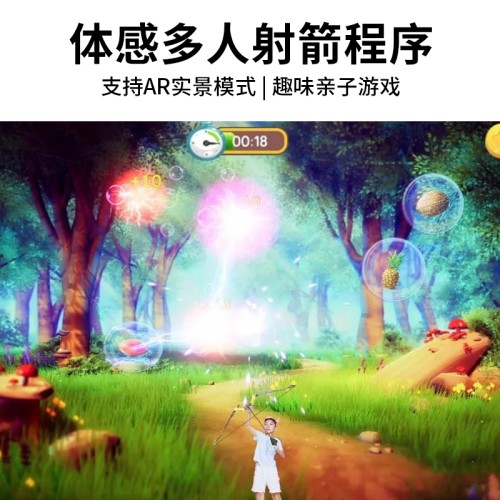体感射箭,射中开始游戏按钮进入游戏,利用左右手拉弓射箭,隔空体感游戏,无需道具,多人参与、亲子互动、其乐无穷,适合商场暖场互动、展厅多媒体互动,支持自定义泡泡中元素、游戏背景等